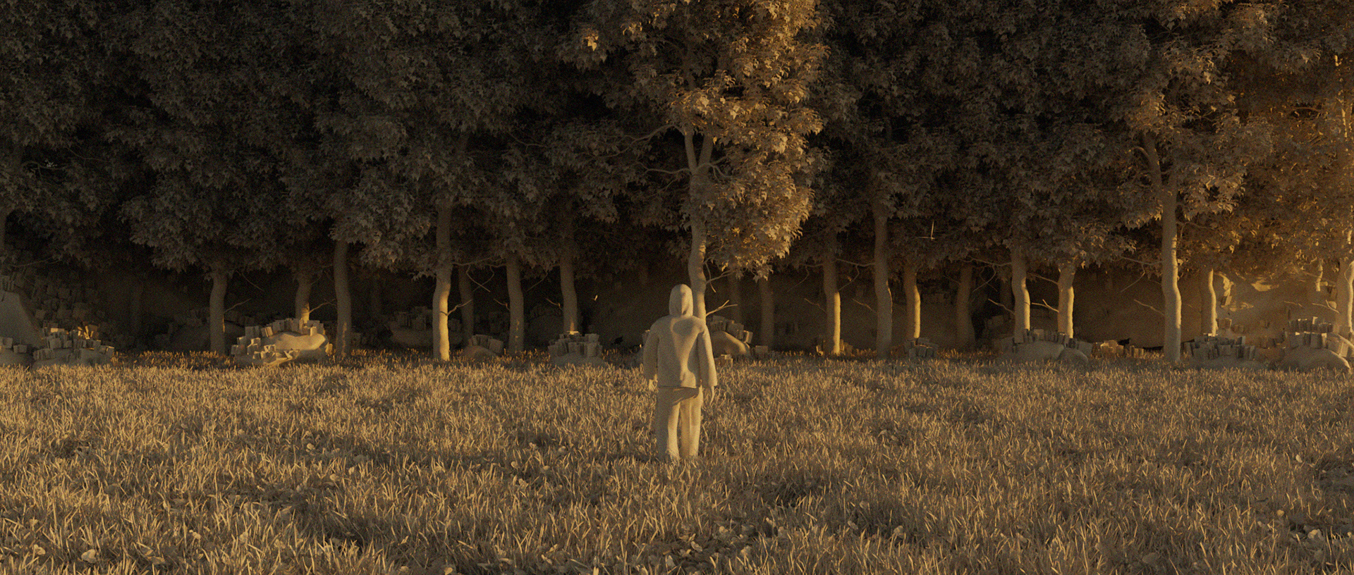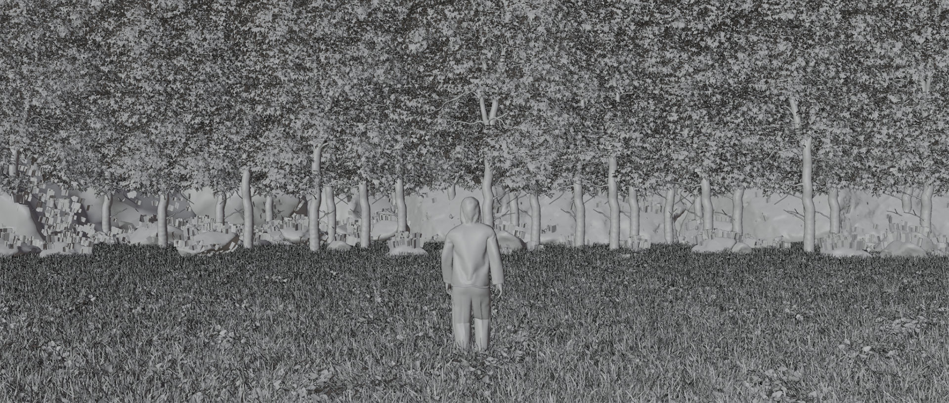 The process began with blocking out the scene in Blender, using a simple figure to define scale and perspective. From modeling and scattering vegetation to shaping the forest, textures were refined to add depth to the foliage and ground. Warm lighting was then introduced to evoke a sense of passage and discovery. Finally, the render was taken into compositing, where colour grading, contrast, and atmosphere were adjusted to balance realism with dreamlike intensity.